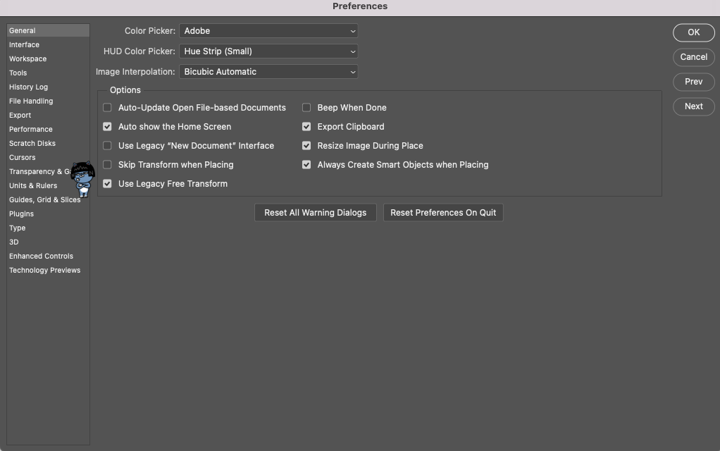 최측 상단 Photoshop 메뉴 > Preferences > General (⌘ Command + K)