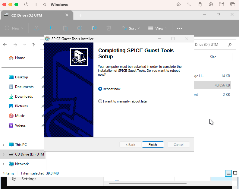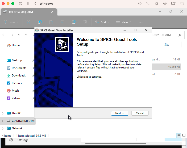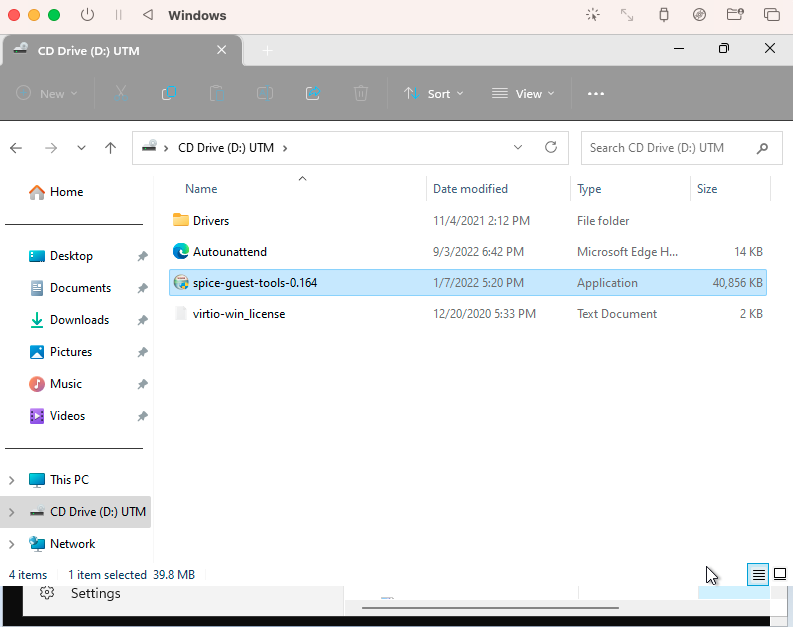 드라이버가 CD Drive (D:) UTM 가상드라이브 안에 있으니 설치합니다.