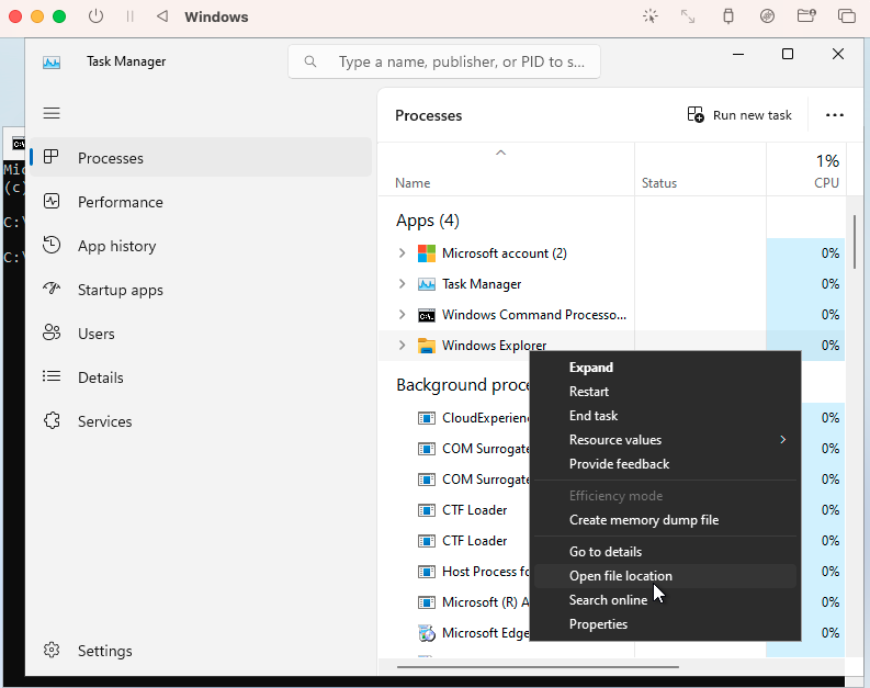 Fn + Shift + F10 또는 Shift + F10 키를 눌러 CMD창을 띄워줍니다. 그리고 taskmgr을 입력하고 엔터!!