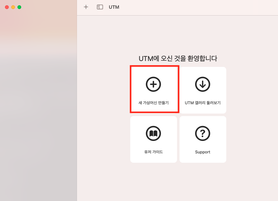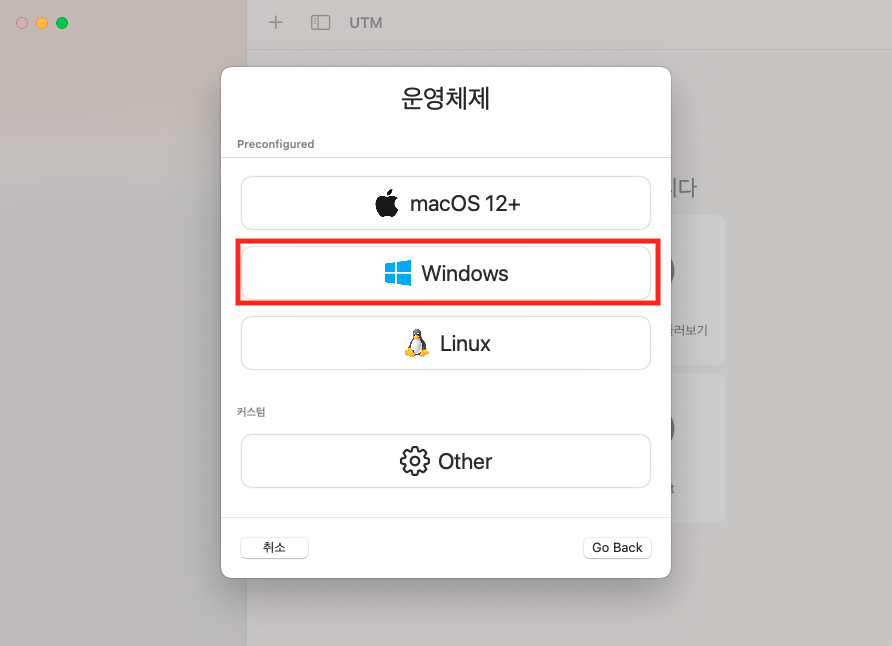 Window 11 VHDX 이미지 다운로드가 완료되면 UTM에서 + 버튼을 클릭하고 운영체제를 선택합니다.
