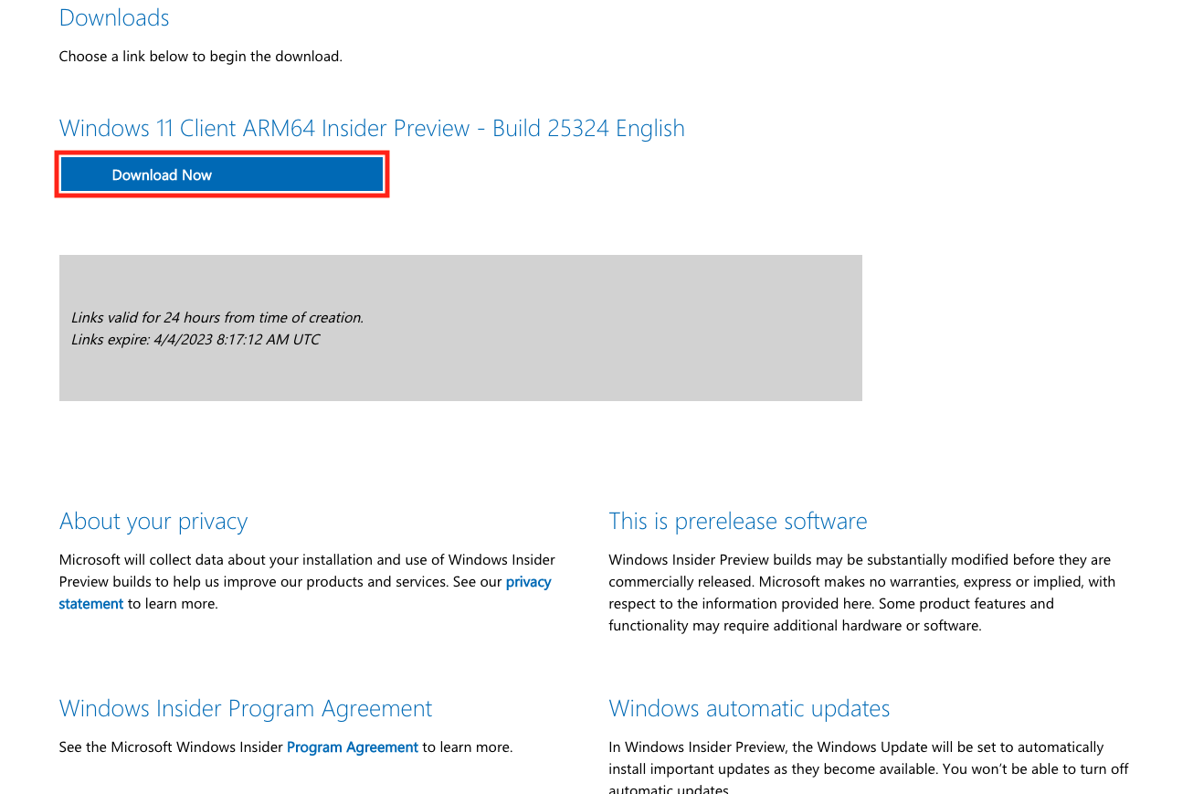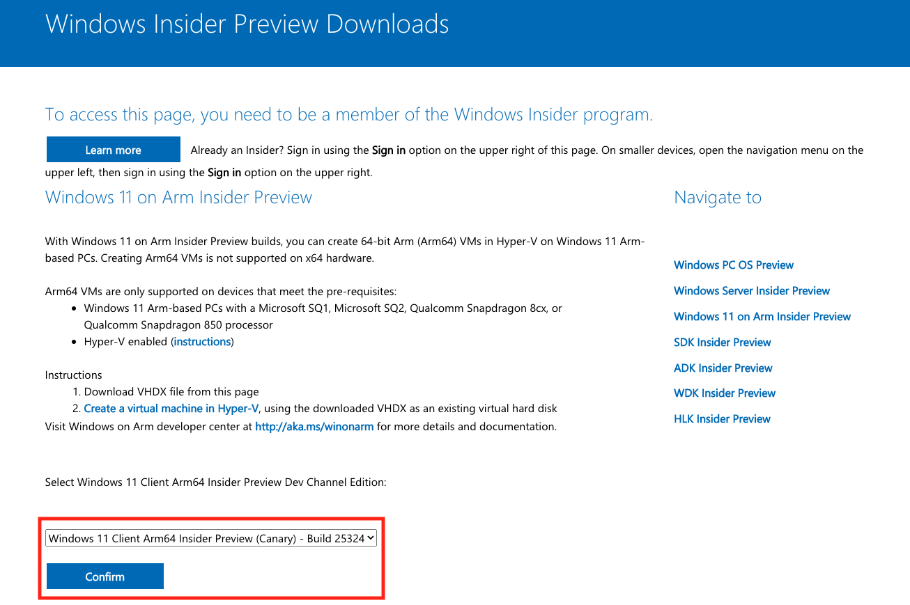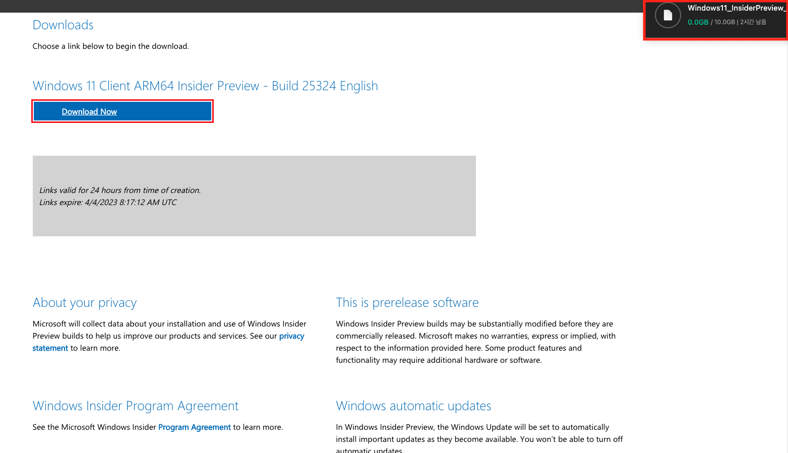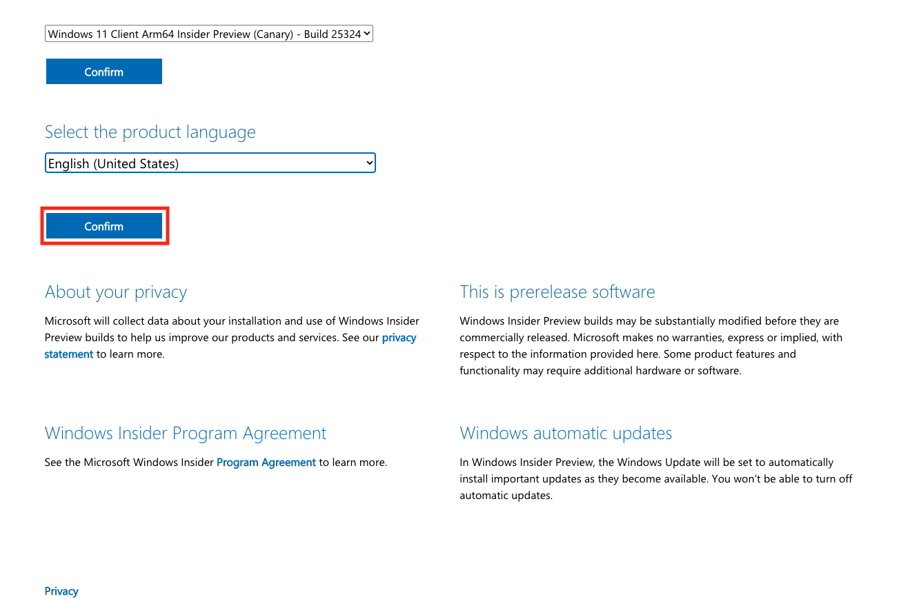 Select edition 에서 Windows 11 Client Arm64 Insider Preview(Canary) - Build 25324 를 선택합니다.