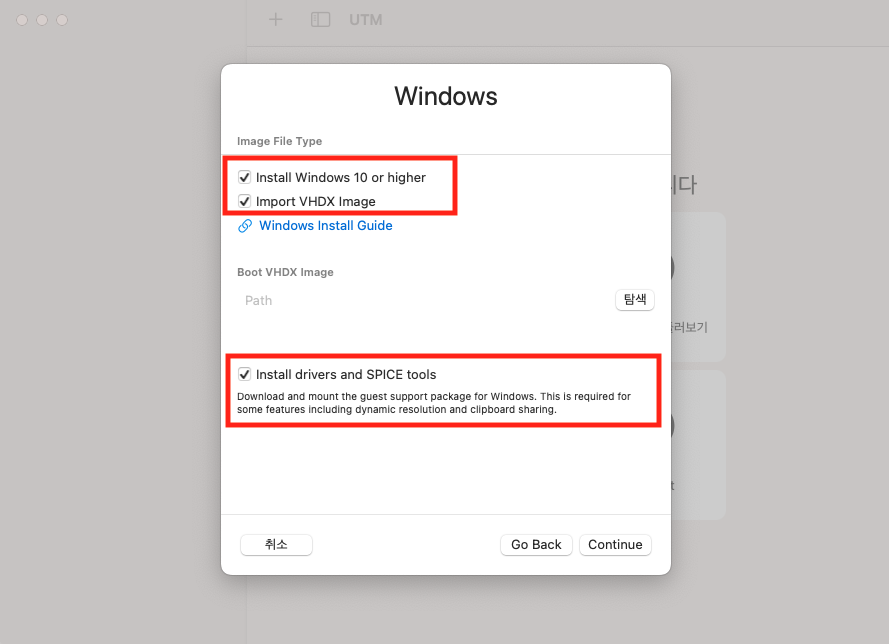 여기서 Install drivers and SPICE tools는 인터넷 연결에 필요한 드라이버 이기 때문에 필수 체크해 주셔야 합니다.